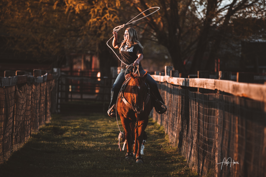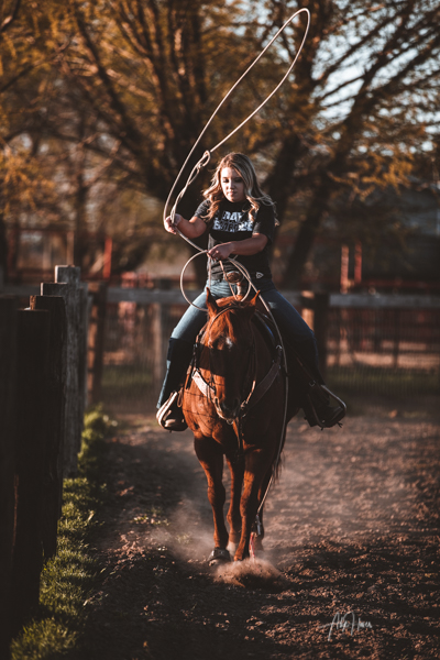 The first couple passes along the fence went pretty good. But about the third time she ran down the fence her horse decided that the cool mountain air, and getting all worked up she would put her head down start bucking! It only lasted for a fraction of a second but I was able to catch it, and both me and Kylee, got a good laugh out of it.